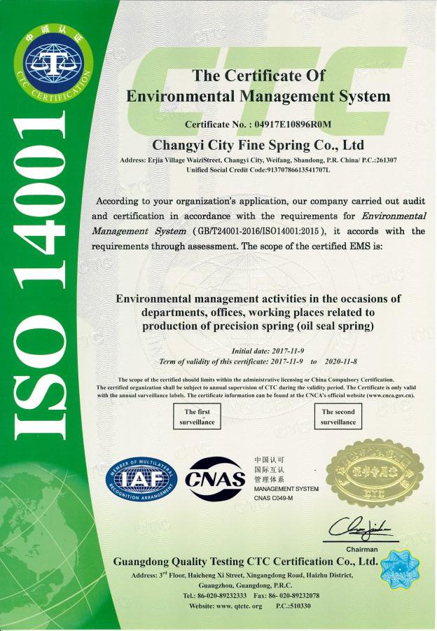 2017年昌邑市精密彈簧有限公司通過ISO14001環(huán)境管理體系認證。